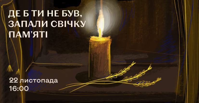 Закликаємо усіх згадати в Загальнонаціональній хвилині мовчання 22 листопада о 16.00 про мільйони людських життів, які Україна втратила через Голодомор і масові штучні голоди. Відвідайте у цей день місця пам’яті жертв Голодомору в своєму населеному пункті. Давайте разом також із настанням темряви запалимо свічки пам’яті на підвіконнях – у домівках, офісах. Адже кожен вогник у вікні – це свідчення того, що ми, живі, пам’ятаємо про померлих, це вияв нашої скорботи і віри в майбутнє.